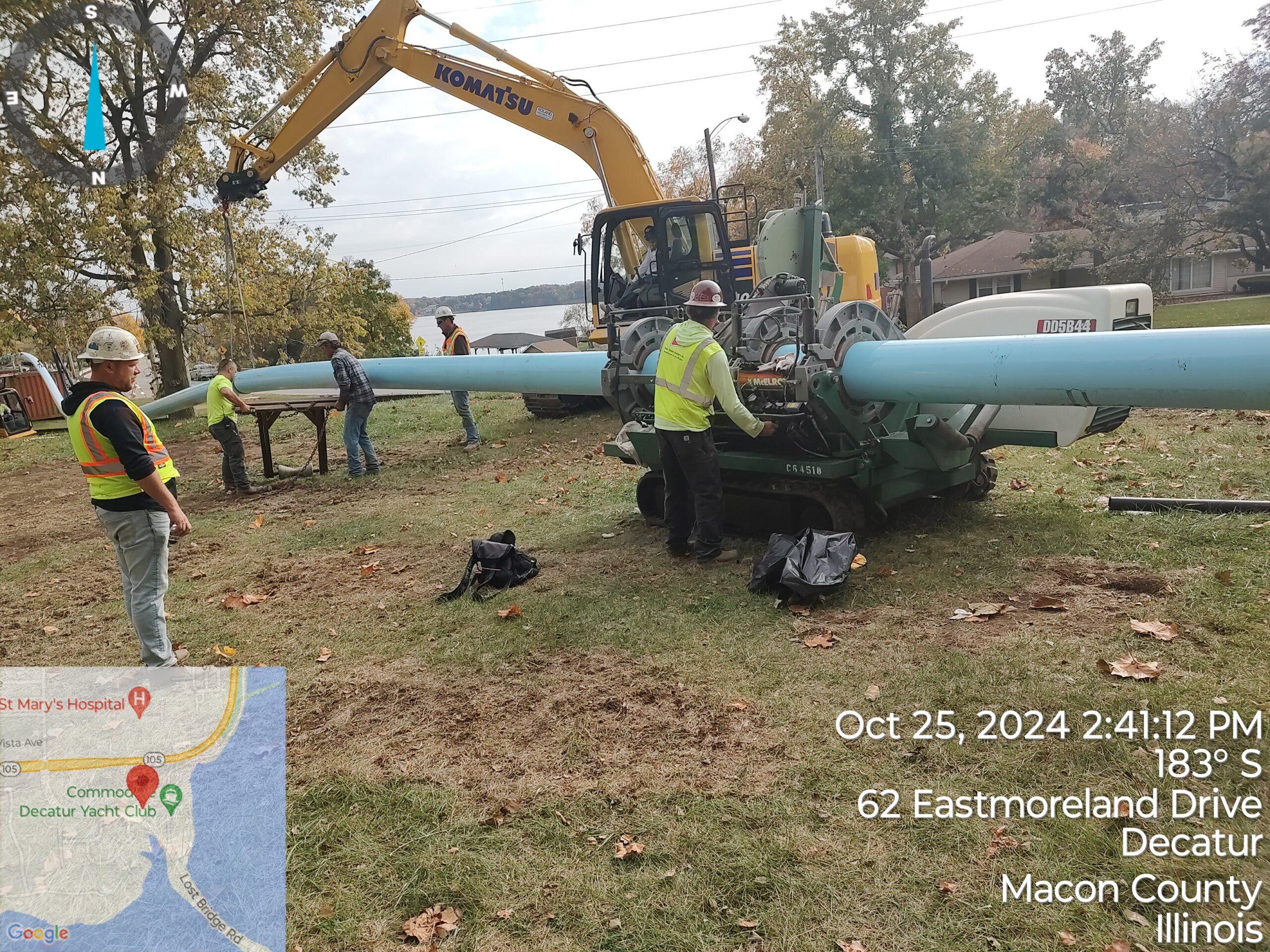 In October, the project team completed the pullback (as seen in the video below), achieving a major step in the installation of the force main. The next step will be to connect the pipe on both sides to the Sanitary District’s existing infrastructure. This infrastructure includes a pump station on the east side of the Lake and an existing force main on the west side. Once connected by the project team, the pipe will be put into operation.